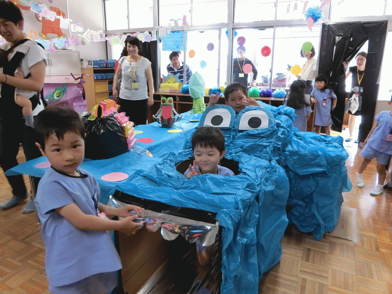 どこのクラスも様々な廃材を使って、思いもつかないような面白い作品がたくさん作り上げられていました(^O^)