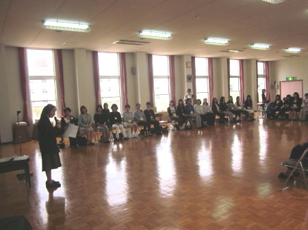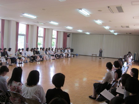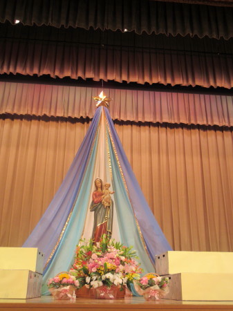 講堂舞台にマリア様が飾られ、心を一つに合わせて集まった私たちを、あたたかく見守ってくださる中、聖母祭が始まりました。