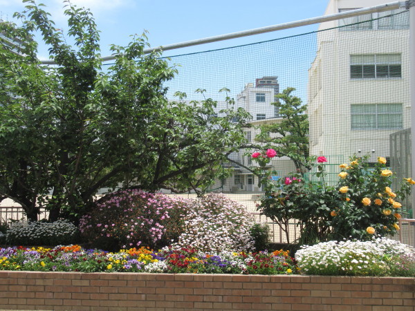 城星学園の正門を入ると、すぐに迎えてくださるマリア様とマリア様を包むバラの花、足元に咲くツツジの花です。
