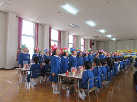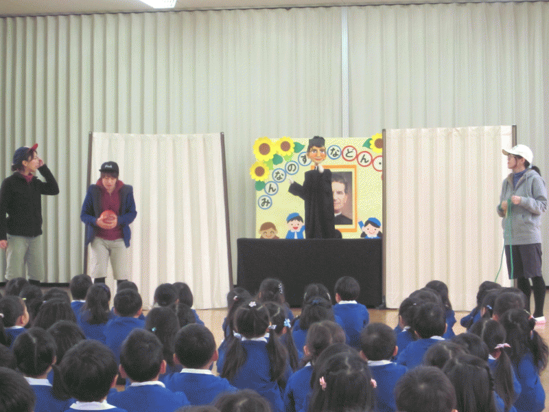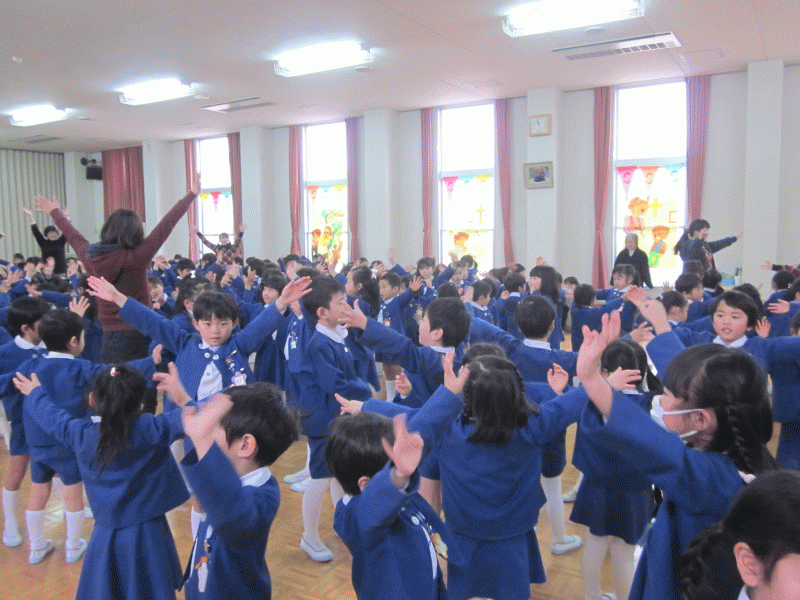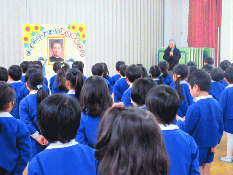 遊戯室に幼稚園のみんなが集まり、心を込めて、「みんなのすきなドン・ボスコ」の歌を歌い、お祈りをお捧げしました!(^^)!
