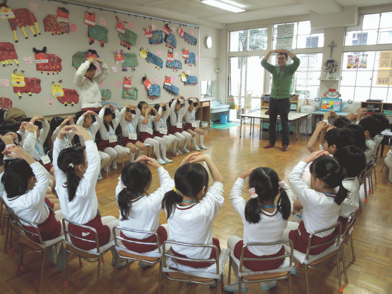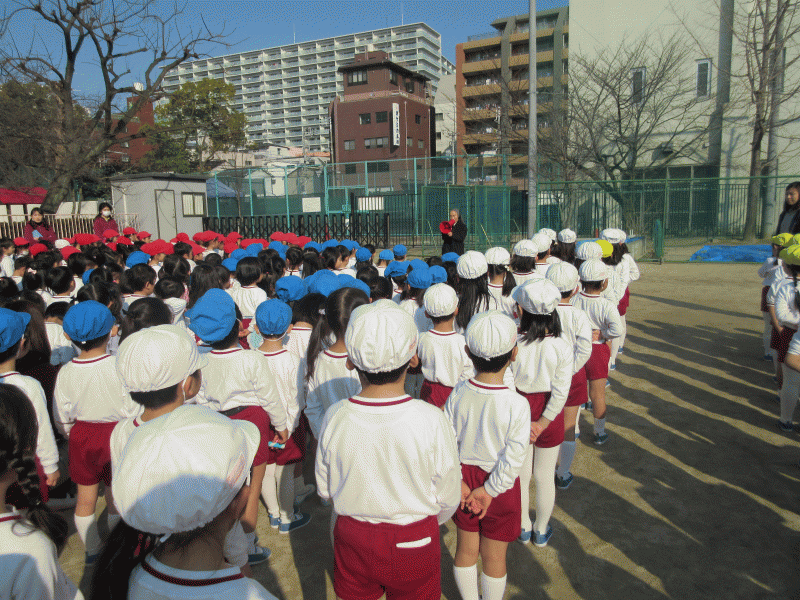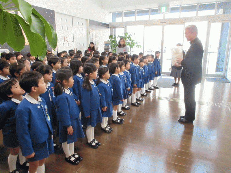 園長先生の話をきちんと座って聞き、世界中の困っている人々へ、