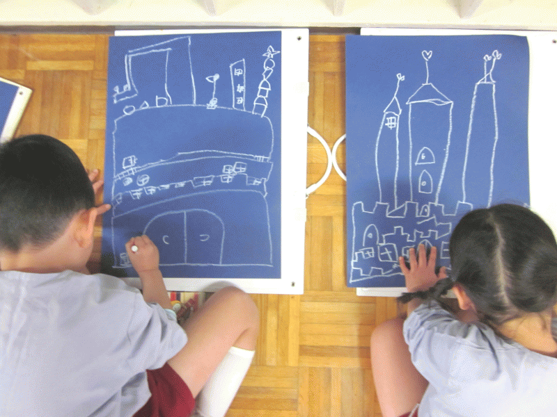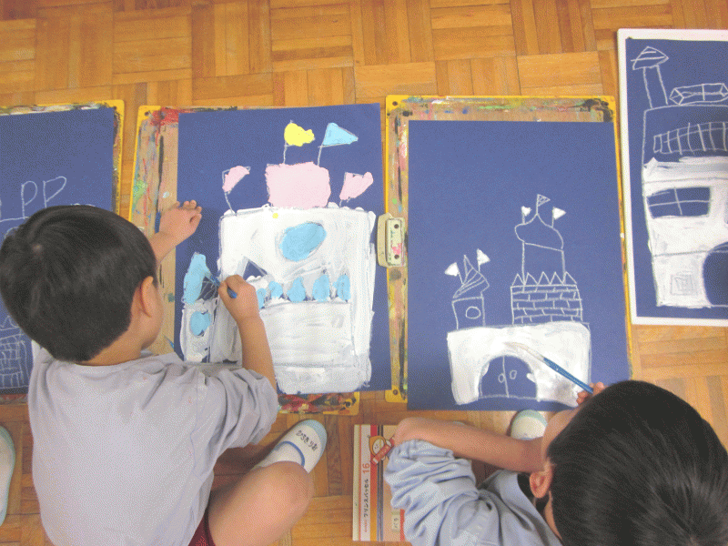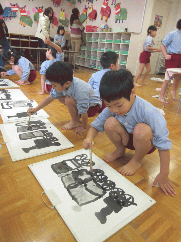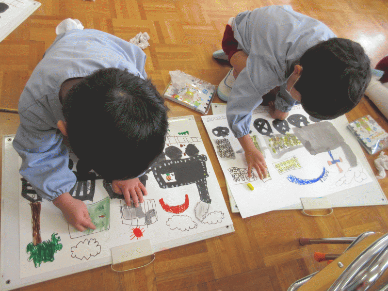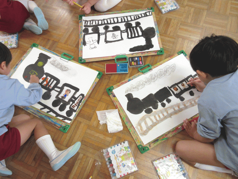 今日は、昨日墨で描いた機関車に、自分や荷物を乗せたり、線路を描いたりしました!