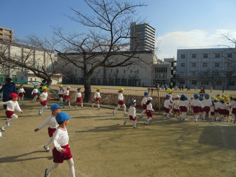 戸外では、広いグラウンドや園庭で遊ぶ子ども達。