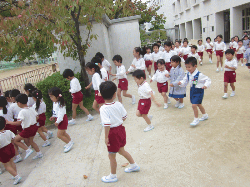 先生の合図で、グラウンドに逃げます。