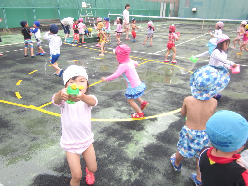 ぐるぐる洗濯機や宝探しをしたり、自由あそびでは、先生対子どもたちで水掛けをしたり…とても充実した時間を過ごすことが出来ました!