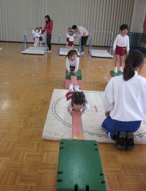 平均台では、腕の力を付ける運動です♪