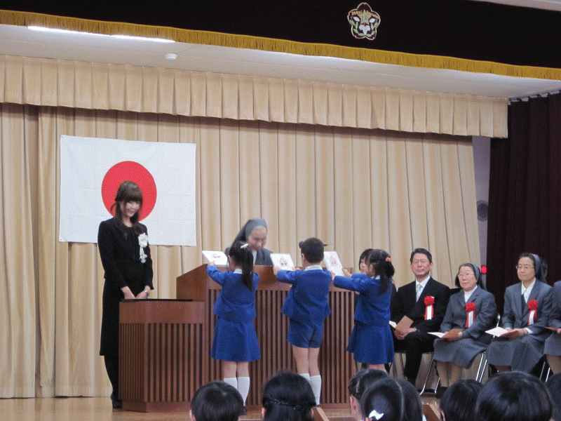 舞台には、来賓のお客様と幼稚園の先生たちが着席し、