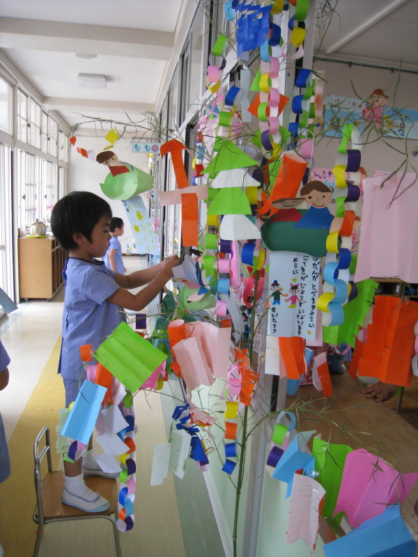自分で描いた短冊をつるしたり、折り紙を切って貼ったりしながら