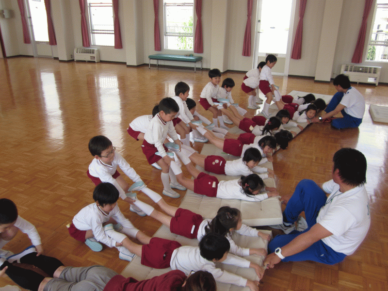 マットでは、膝立ちで歩いたり、四つんばいでクマ歩きをしたり、