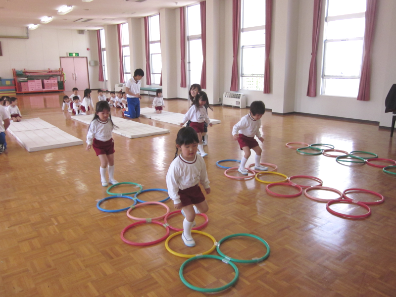 次に、“グーパー グーパー”とフープの上を跳んで、平均台をわたってゴール!!