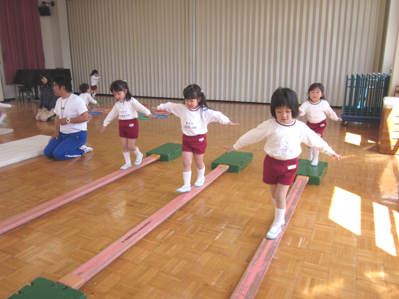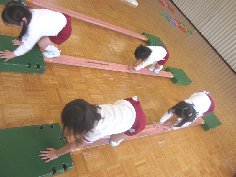 平均台は、腕をピンと伸ばしてバランス良く歩きます(*^_^*)