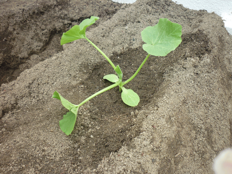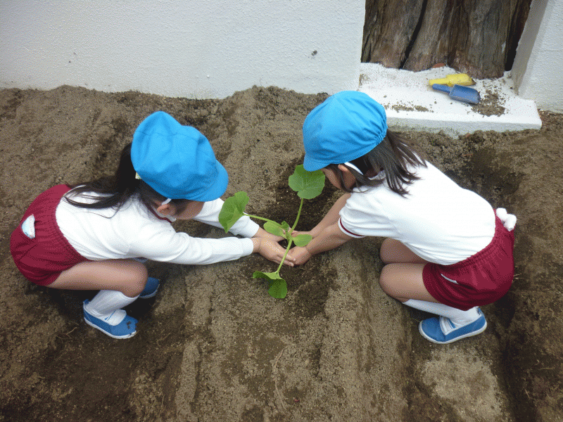 元気に育つように祈りながら、かぼちゃの苗を植えて…