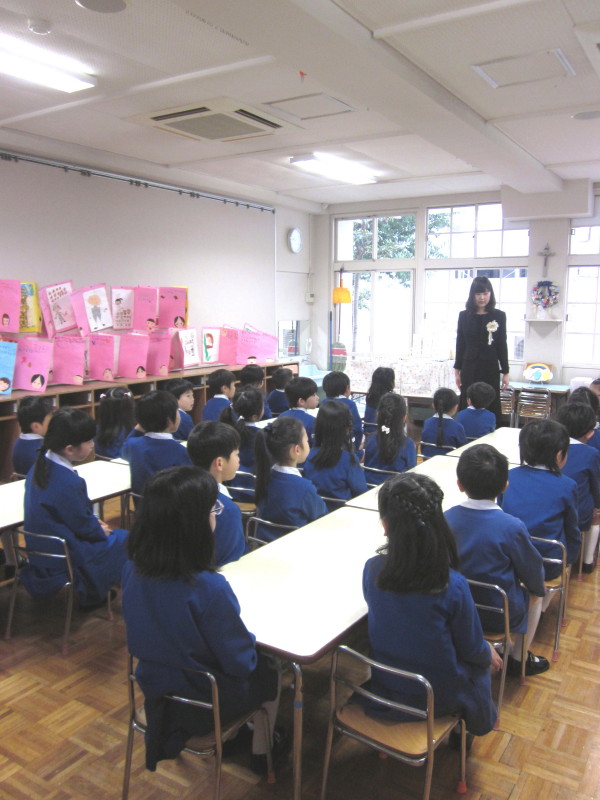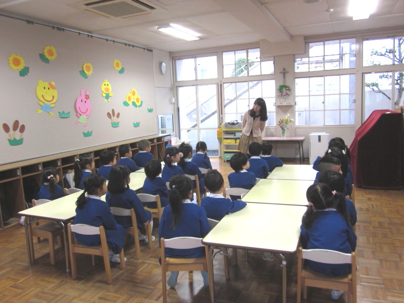 式の前、保育室で先生から最後のお話を聞きます。
