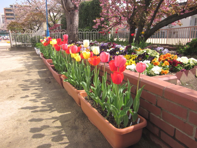 子どもたちを、綺麗に咲いたチューリップの花が迎えていました。