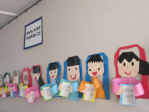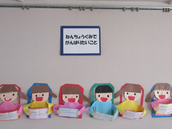 年中組の3月壁面は、紙制作「年長組で頑張りたいこと」を作りました♪