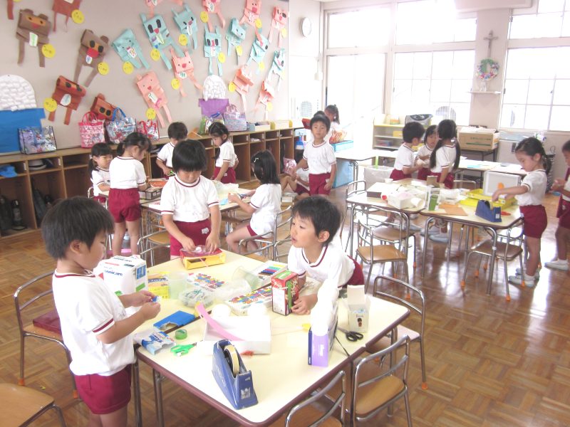 製作コーナーでは、空き箱やリボンを使って思い思いの作品を作りました(*^^)v