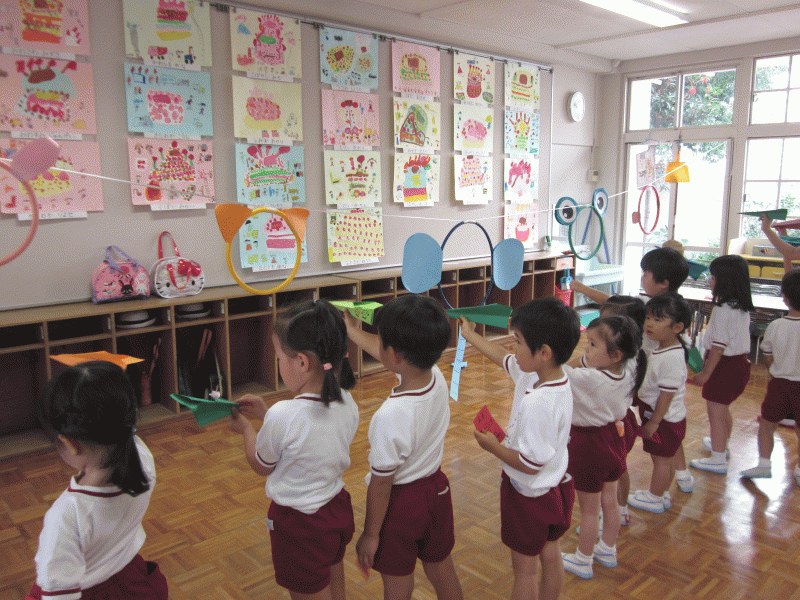 飛行機コーナーでは、自分だけの飛行機を画用紙で作って、ゾウやウサギなどのフープの間を上手に飛ばしていました。