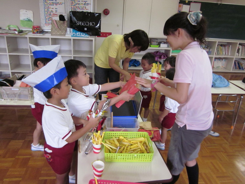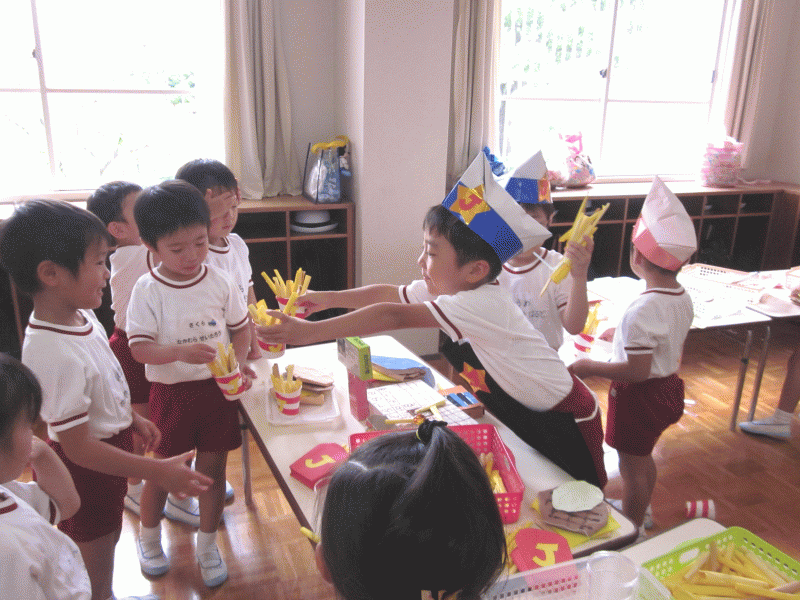 うめ組では、昨日遊んだJ☆バーガーのお店を開いて、お客さんに“ポテト”や“バーガー”を作る姿が見られていました。