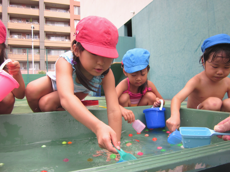 ボールすくいや、ままごと遊び、水の掛け合いっこをして