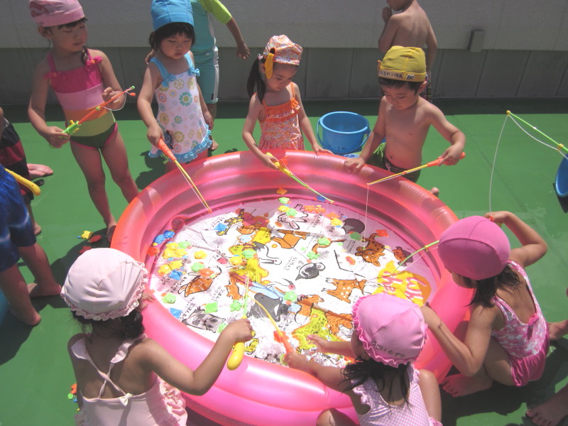 9時にオープンしてから、水着に着替えた子どもたちがゾクゾクやってきて、水の掛け合いっこをしたり、金魚すくいをして遊びました(^^)