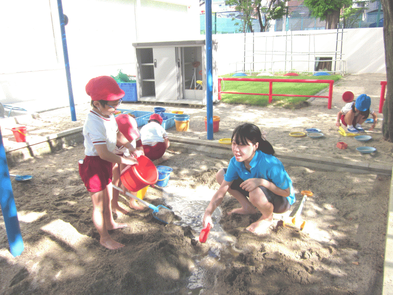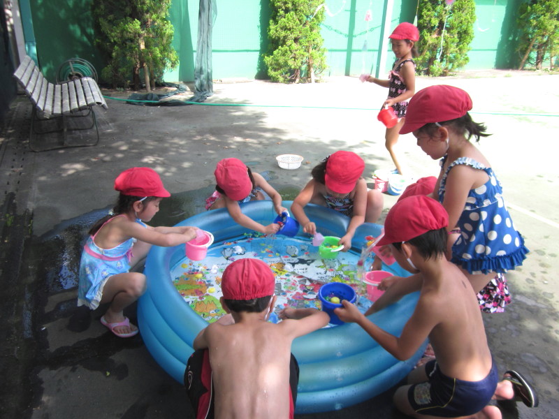 水掛けごっこをしたり、ボール拾いゲームをしたり…