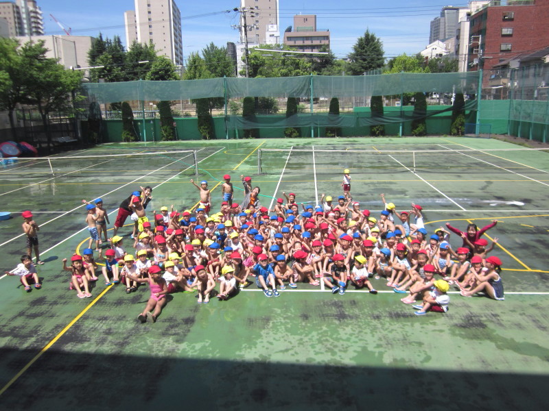 とっても良いお天気の中、テニスコートで水遊びを行いました。