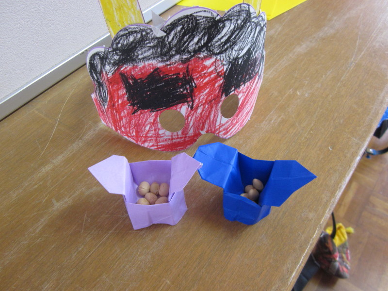 さくらぐみは、鬼のお面をつけて、色紙で作った豆を