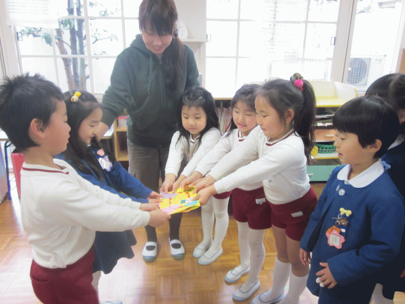 お別れ会の前日、年中、年少組から年長組に素敵な手作りのカードを渡しに行きました(^^♪