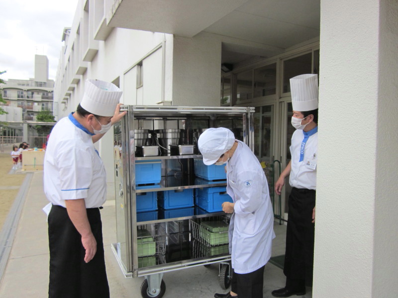今日の給食が、この大きなコンテナに入って、運び込まれてきました。