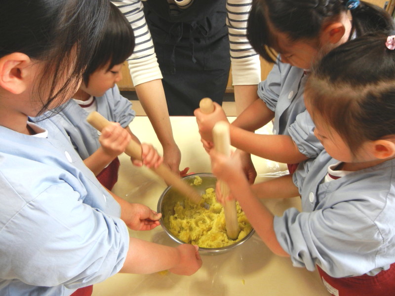 今日は、年長組の芋ほり遠足で取れたサツマイモと、年中組が園で育てたサツマイモを使ってスイートポテトを作りました。