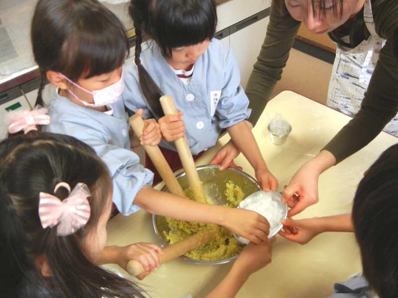 お母様にお手伝いいただいて、スイートポテト作りの