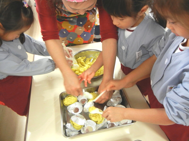 出来上がったスイートポテトは、年少組・年中組にもおすそ分けです(^▽^)