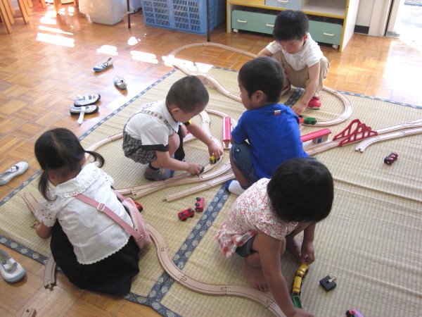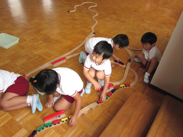 レールをつないで、汽車で遊ぶ子どもたちもいました。