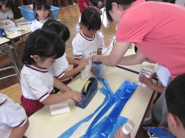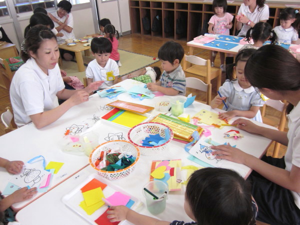 先生と一緒に、折り紙を使ったり、シールを貼ったり…