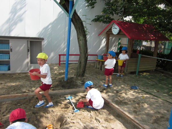 途中からは、いつもは砂遊びで使っているバケツも登場して