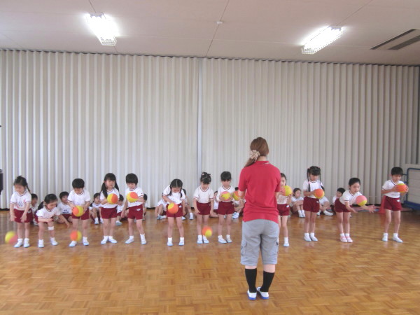 真剣な表情でボールをついたり、上に投げたりする子ども達。はじめはボールがあちこちに散って、少しアタフタする様子もありましたが、繰り返しするうちに、だんだん上手になっていきました(^▽^)