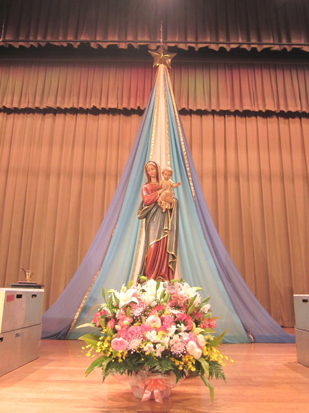 講堂舞台にマリア様が飾られ、温かい眼差しで私たちを見守ってくださっています。