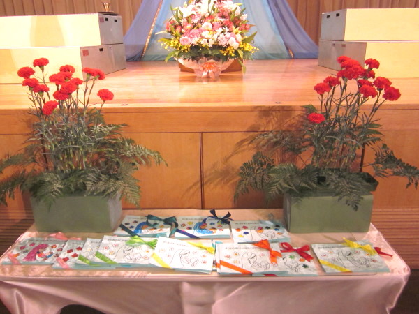 カーネーションを捧げた後は、年長組・年中組、年少組の代表の子どもたちが、クラスのみんなのカードを祭壇にお捧げします。