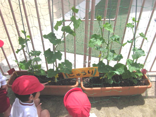 「せんせい〜!きゅうりにお花がさいてるよ!」