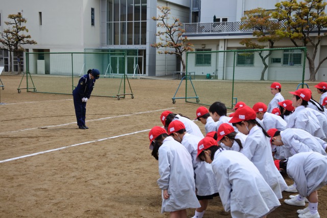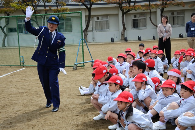 入学式から自分の力で新しい通学路を歩いてきた1年生のみんなは,登下校の最中安全に過ごすことができるよう,警察の方のお話に一生懸命耳を傾けました。
