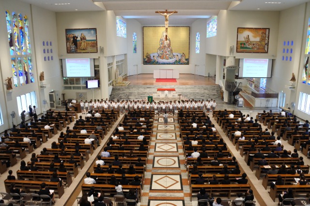 さて、地震発生後直ちに教職員と専門業者による学園内の施設設備の安全点検を実施いたしました。その結果、説明会の会場である学園講堂の天井裏の点検には、時間を要することから、安全確保のため急遽学園西側のカトリック玉造教会(大阪カテドラル聖マリア大聖堂)をお借りして実施させていただくことになりました。