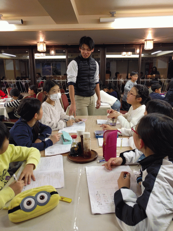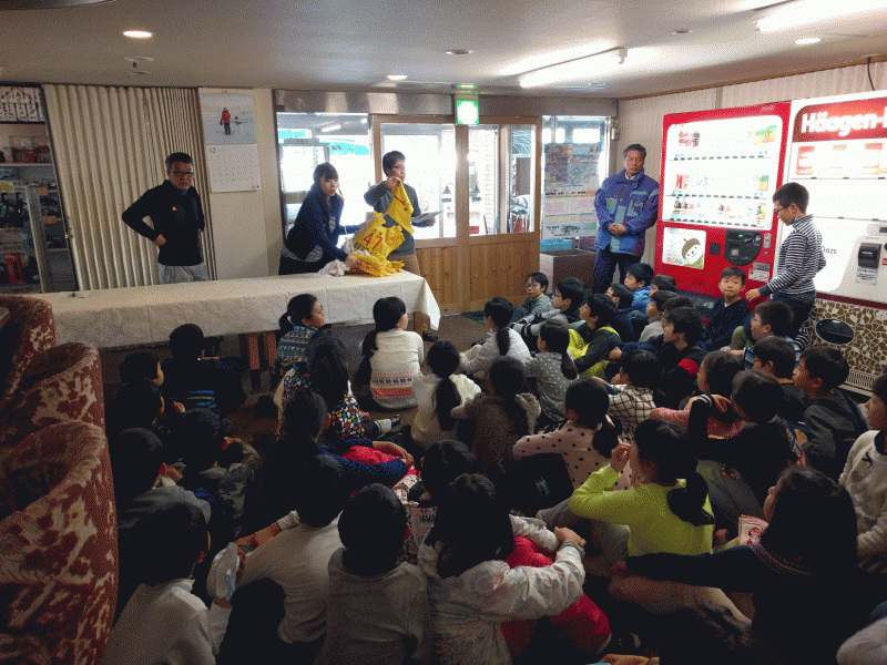 夕食後に、スキー学習会が行われました。スキーの滑り方だけでなく、志賀高原のことも教えてくださいました。ウサギの足跡が雪山に残っていることに気づいていた人は多かったけど、野生のサルも出没することがあるらしいですよ!