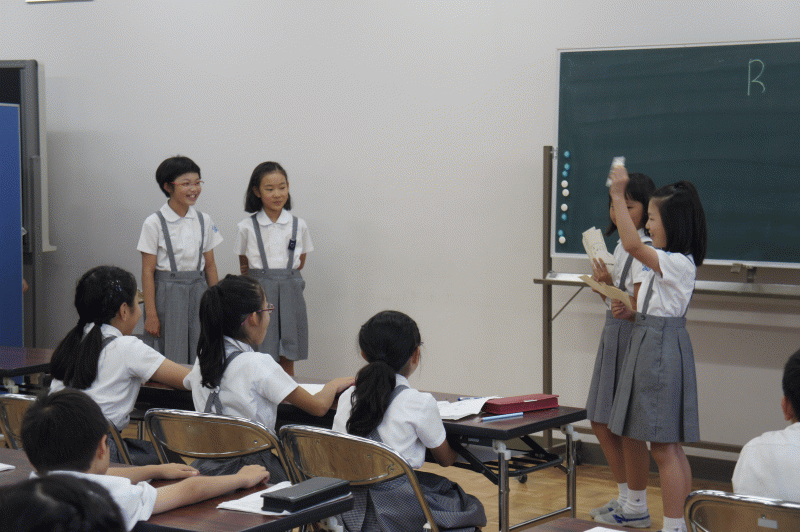 英語で学校紹介です。少し緊張しましたが元気に挨拶し、笑顔で"Top of the World"を歌うことができました!