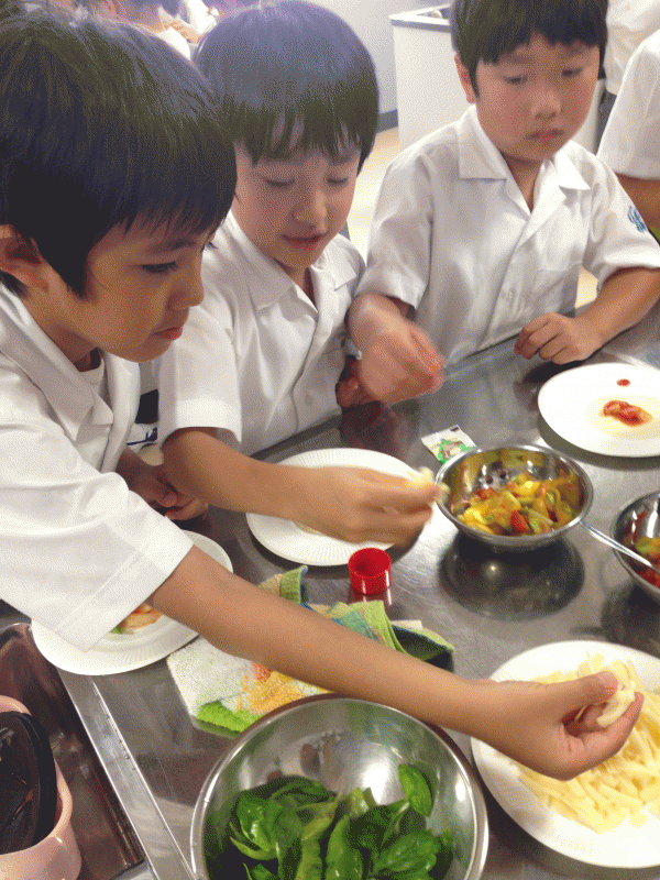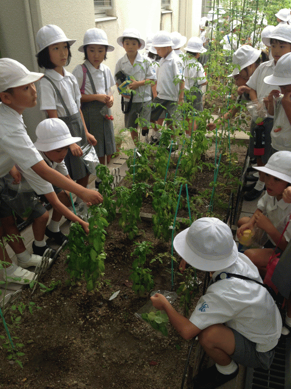 今日はトマト登校日、2年生が学級園で育てたトマトとバジルを収穫します。