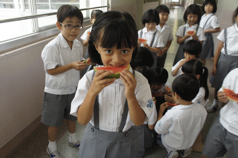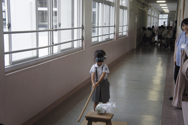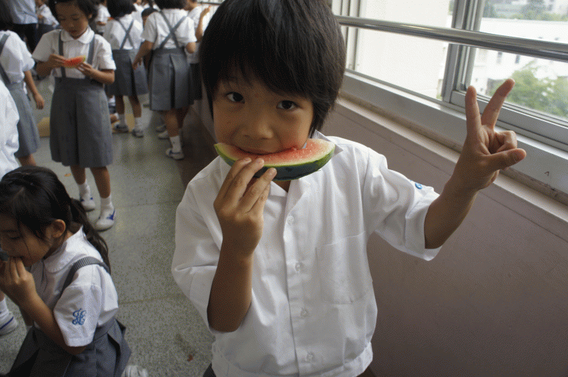 残念ながら雨でしたが、学校の廊下で収穫したスイカでスイカ割です!
