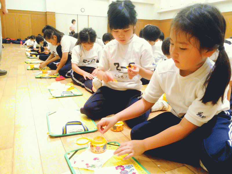 押し花を貼る表情は真剣そのものです!上手に貼れるかなぁー?