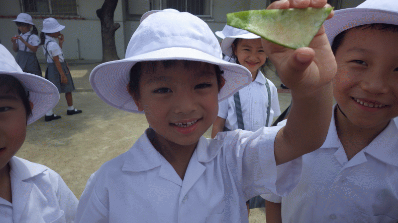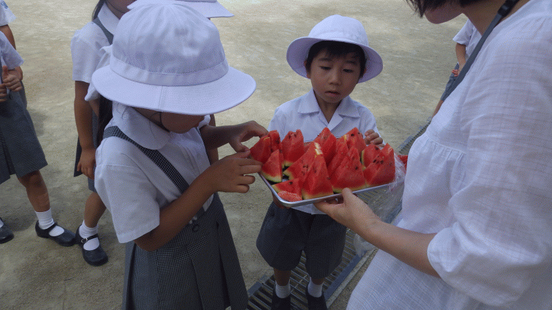 1年生が生活科で観察を続けてきた小玉スイカが食べごろになったのです。