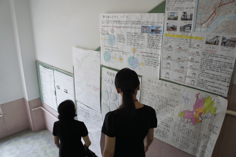 各教室の前や廊下に飾られている夏休みの自由研究や工作にも興味津々。