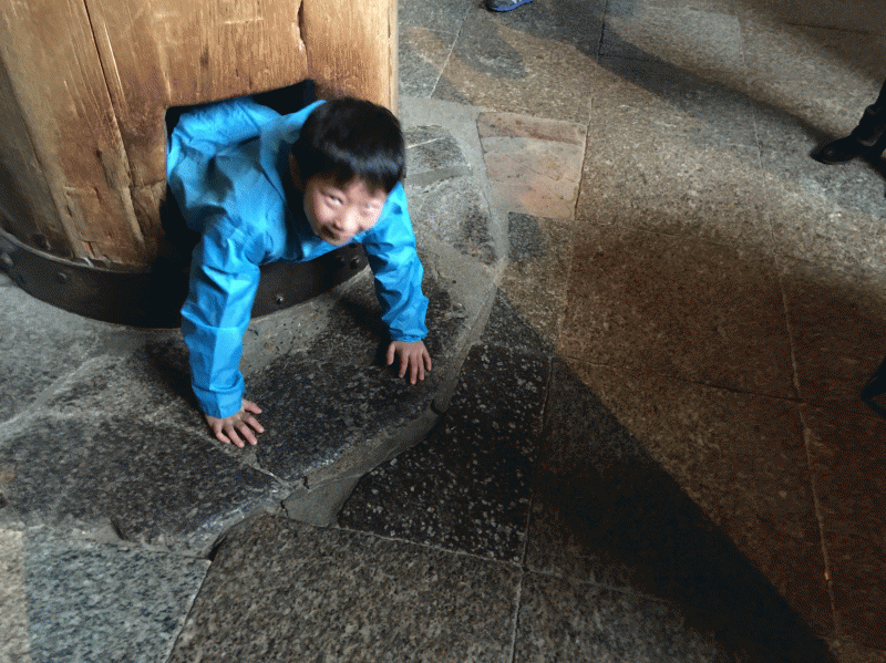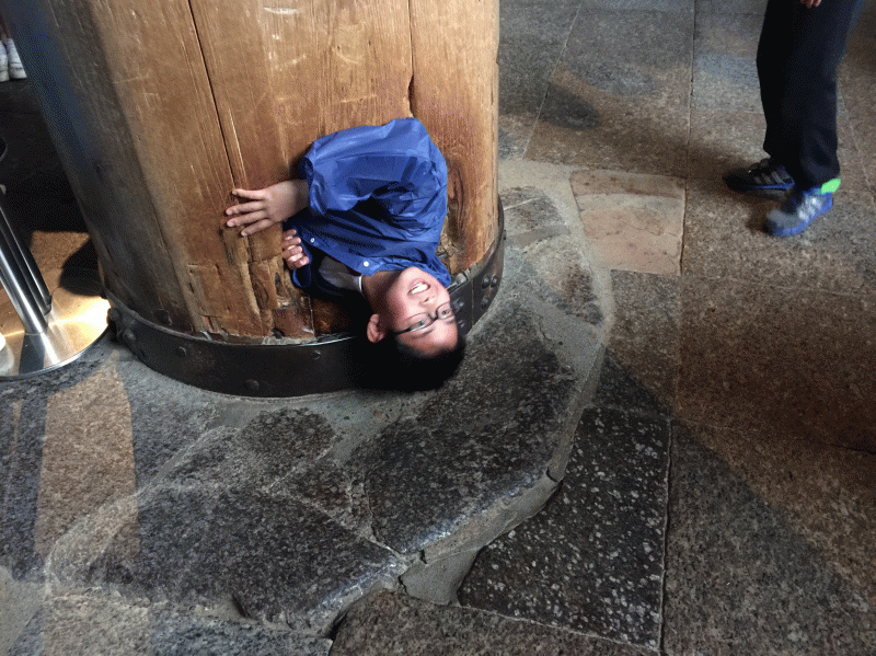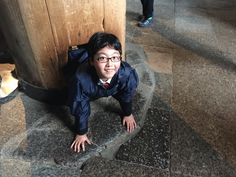 大仏の鼻と同じ大きさの穴をくぐってみました。うまくいけば願い事が叶うそうです。「先生は無理ですね」という声。大きなお世話ですよ!