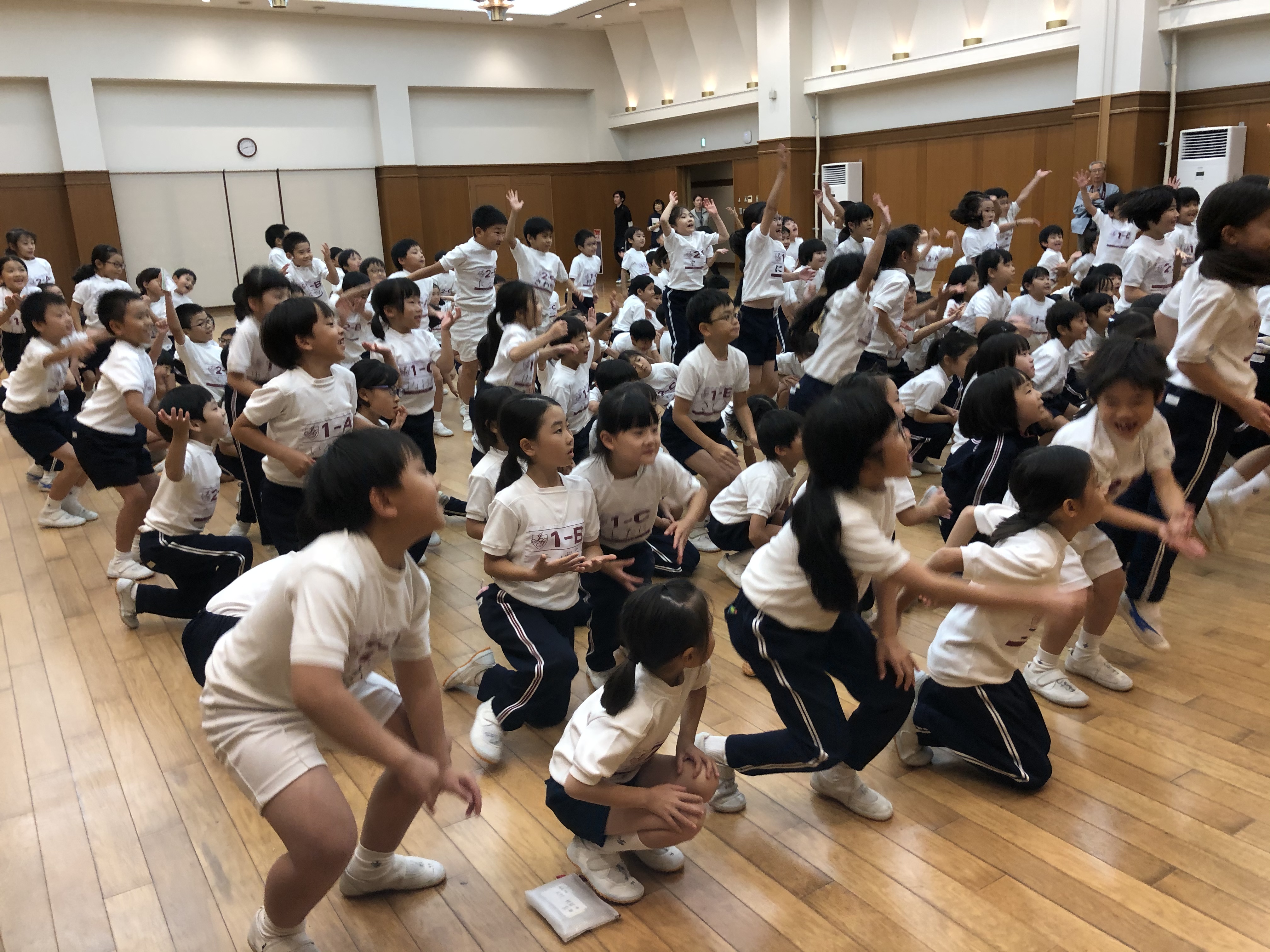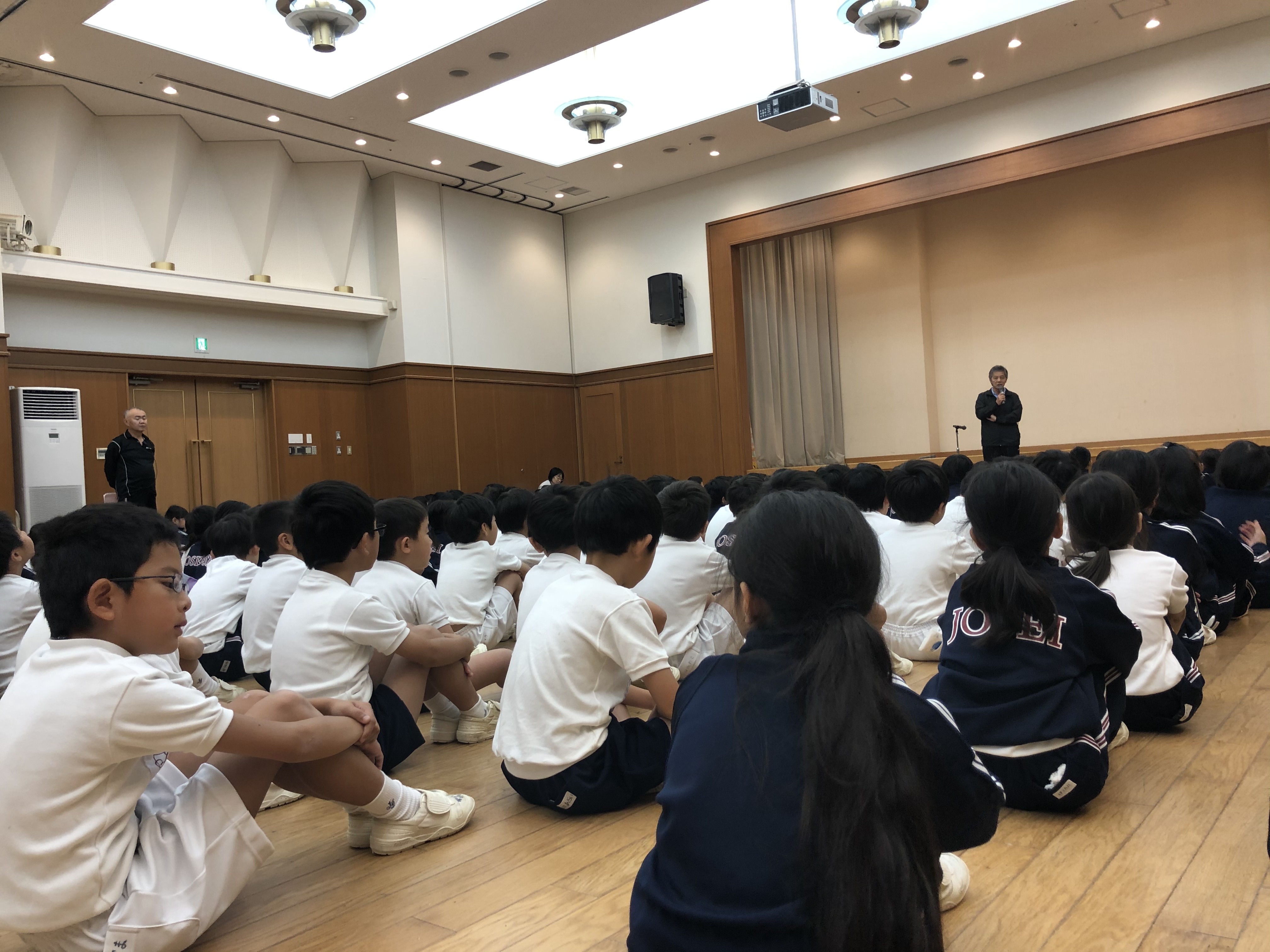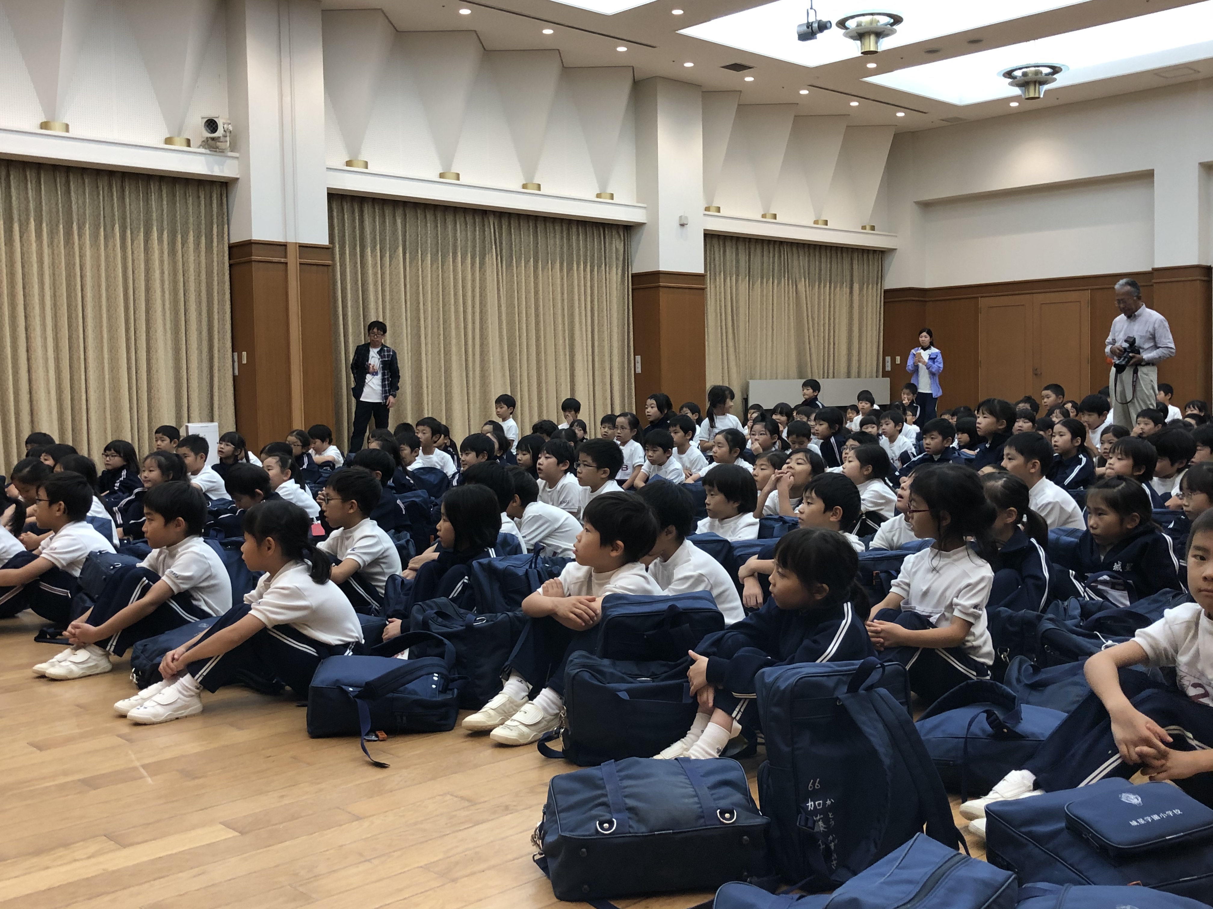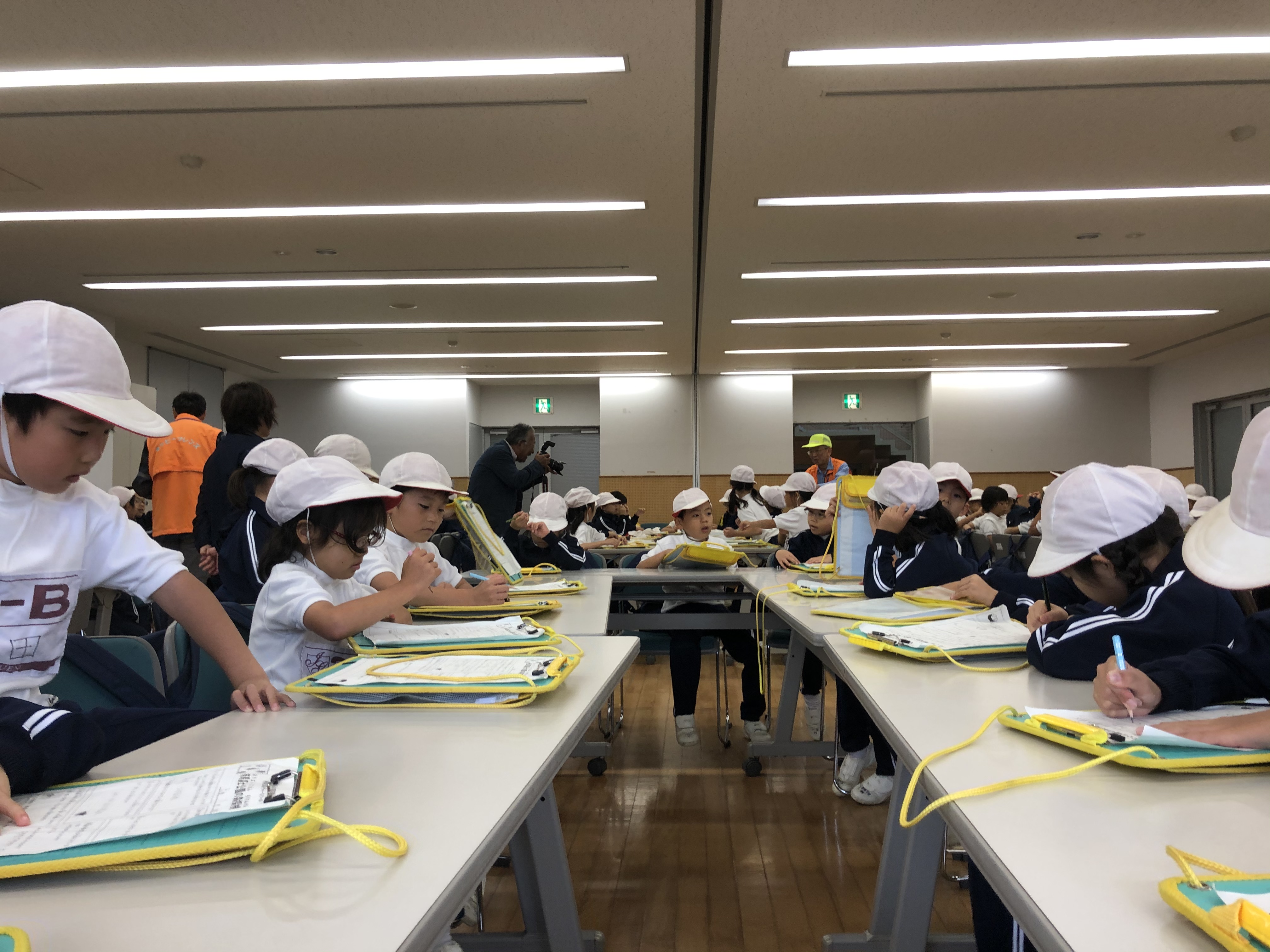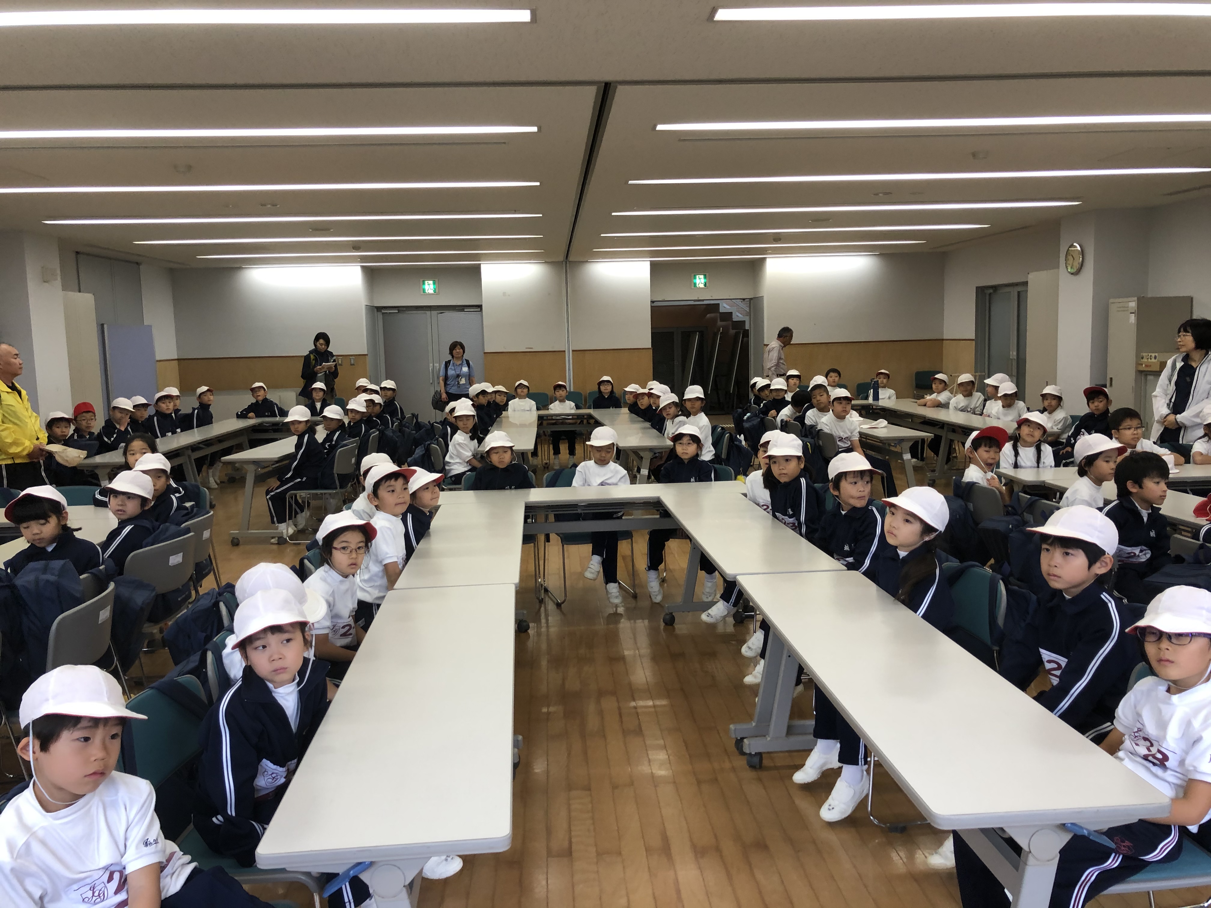 ユニトピアささやまに無事到着しました。開校式を終えて避難訓練を行なっています。